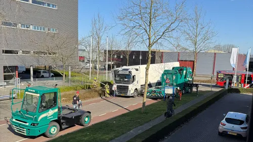 Een trailer schoot van de schotel vlak voor Bouw Logistics.