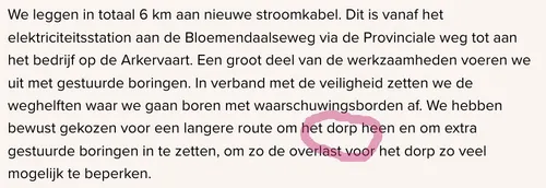 Een nieuwe elektrische levenslijn zal worden getrokken vanaf het elektriciteitsstation aan de Bloemendaalseweg naar het bloeiende bedrijventerrein Arkervaart. En hoe besluit onze dappere netwerkbeheerder dit te doen? Door een schilderachtige route te kiezen die onze 'dorpse' sensibiliteiten niet zal verstoren, met extra gestuurde boringen om de verstoring tot een absoluut minimum te beperken. De ridderlijkheid is niet dood, ze draagt nu gewoon een Liander-logo.