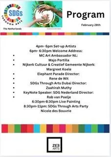 Sinds 2020 zet ‘SDGs through Arts’ zich in om de SDG’s wereldwijd onder de aandacht te brengen, zelfs in uitdagende tijden. Kunst blijft een universele taal die inspireert en verbindt. Dit evenement biedt kunstenaars de kans hun visie te delen en draagt bij aan een duurzamere en inclusieve samenleving.