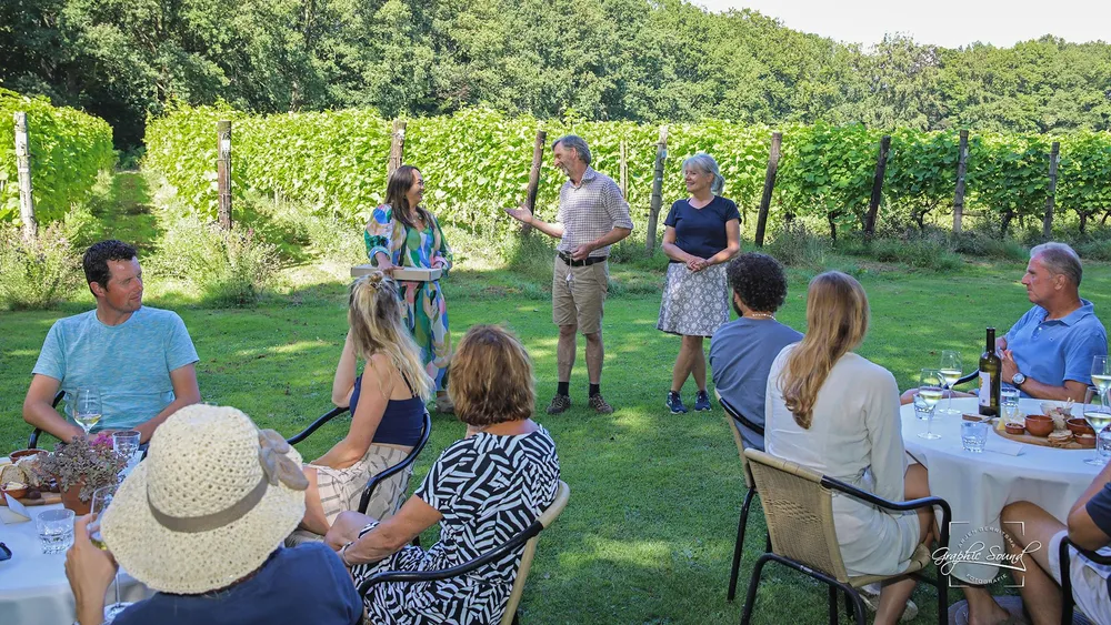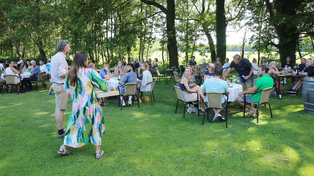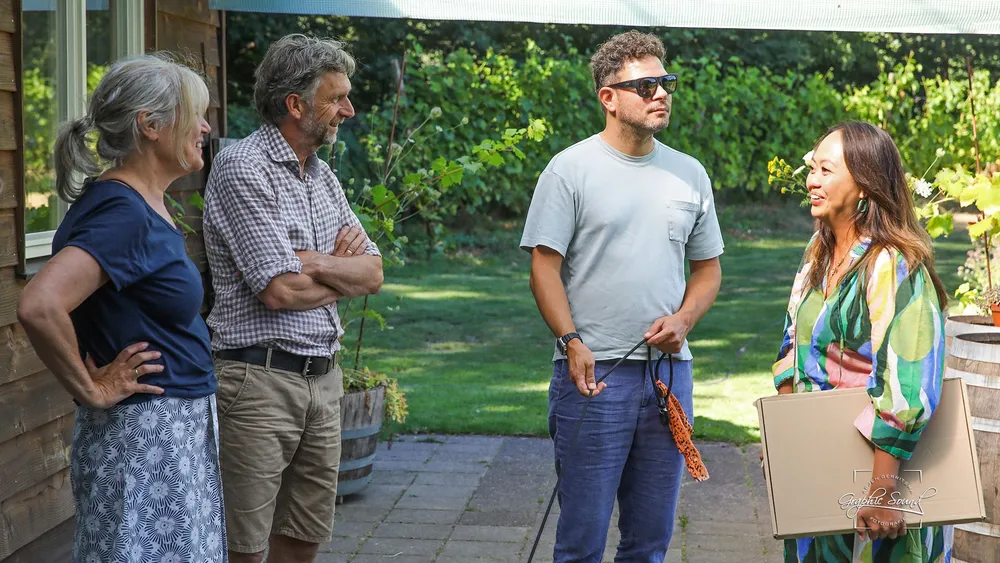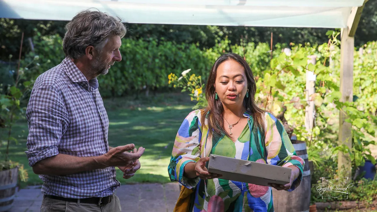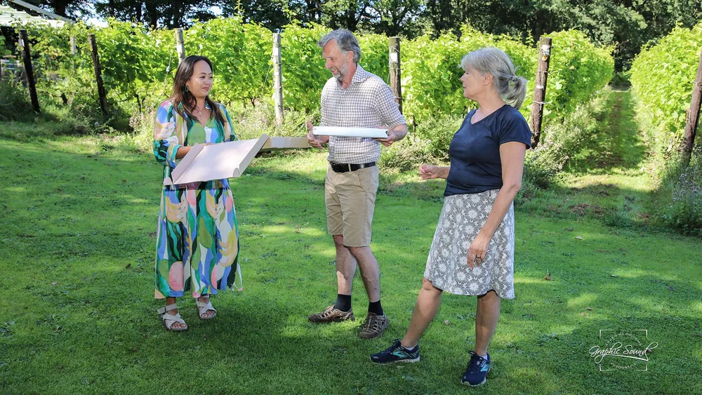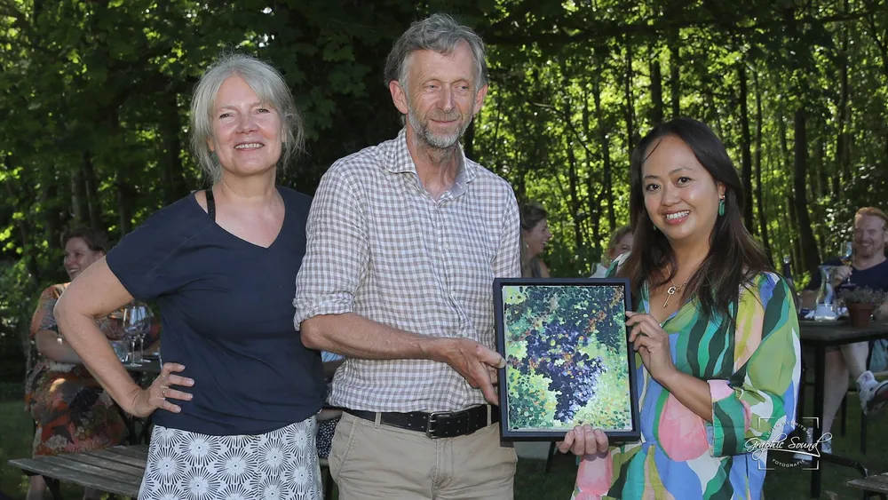 Het is bijna een jaar geleden dat de opnames werden gemaakt op de wijngaard en dat Jasamine haar winnende werk heeft gemaakt. Een pointillistisch werk is het geworden. Dat krijgt nu zijn plaats in de ontvangstruimte op de wijngaard.