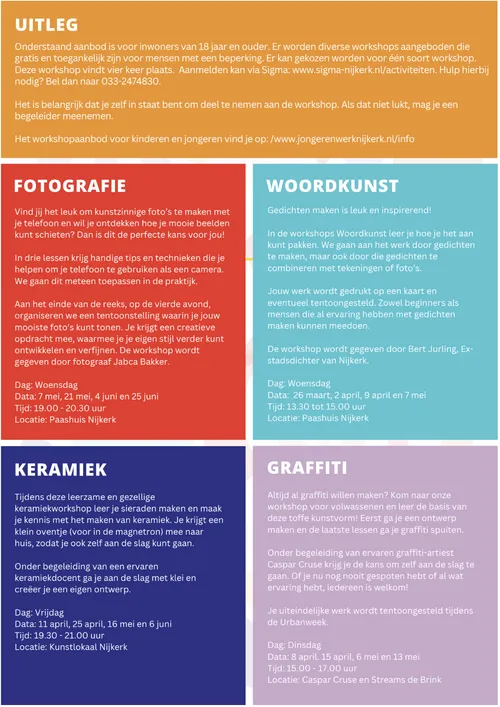 Het project biedt vier inspirerende workshops waar je als inwoner gratis aan deel kunt nemen. De workshops zijn speciaal ontworpen voor iedereen die graag creatief bezig wil zijn, of je nu een beginner bent of al enige ervaring hebt.