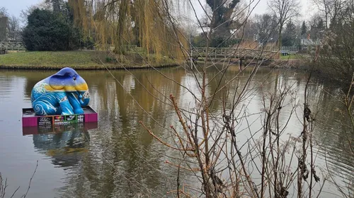 Donderdagmiddag is één van de 28 olifanten van de Elephant Parade in het Stadspark van de kern Nijkerk te water gelaten. Spannend was het nog wel, want hij bleef op de kant steken. Uiteiondelijk is het gelukty.