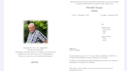 Kennisgeving van het overlijden van Henk Koops
