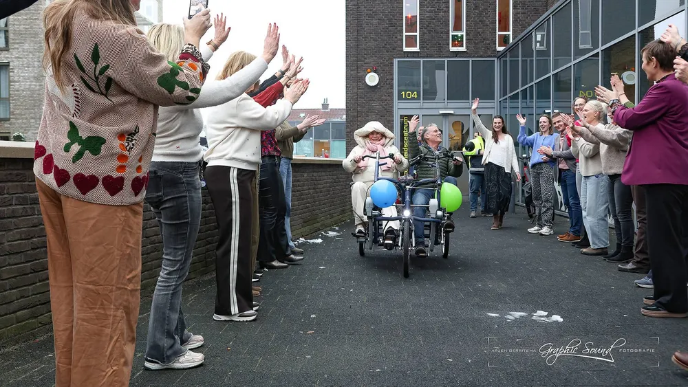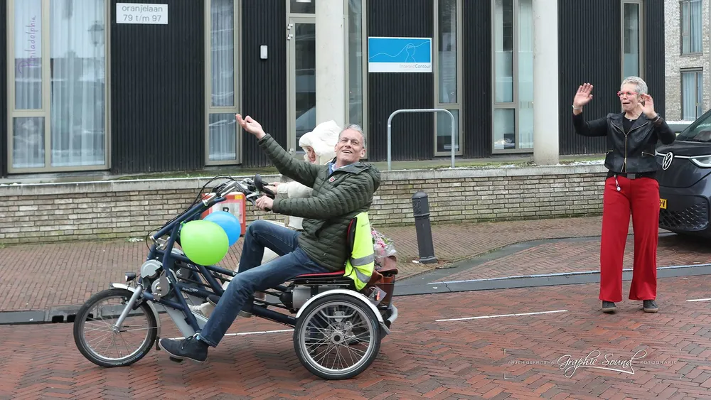 Het afscheid begon op een bijzondere manier in de praktijk. Om 15.30 uur werd Hans van Daalen op ludieke wijze uitgezwaaid door collega's en andere zorgverleners. Zij verzamelden zich op de muziek van Coldplay. Daarna vertrok Hans met zijn vrouw in een duofiets van het Hospice naar 't Koetshuis voor de patiëntenreceptie.