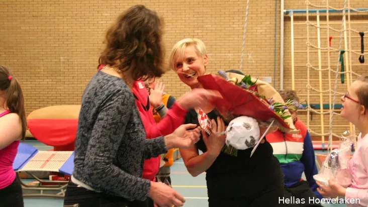 Maar dat is nog niet alles: Dit jaar viert ze nog een jubileum! Op 1 april 2016 is het 12,5 jaar geleden dat ze Gym Extra heeft opgezet bij Hellas Hoevelaken. Op woensdag 30 maart is er van 18.00 uur tot 19.00 uur een jubileumles 12,5 jaar Gym Extra in De Ridderspoor te Hoevelaken. Gym Extra is er voor kinderen die in de gymlessen op school geen uitblinkers zijn en/of vaak aan de zijlijn staan, en voor kinderen die het moeilijk vinden om samen te werken. Bij Hellas horen ze bij de club en kunnen ze ook meedoen aan verenigingsactiviteiten als Pietengym en het kamp. Ook bevordert Gym Extra de sociaal-emotionele ontwikkeling en de leerprestaties. De opbouw van het lesprogramma laat kinderen ervaren dat zij plezier krijgen in het bewegen en dat zij daardoor vooruitgang boeken in hun motorische ontwikkeling.Hierdoor wordt het zelfvertrouwen vergroot en ervaren kinderen dat samen sporten fijn is. Gezelligheid en bewegen met plezier staan voorop.