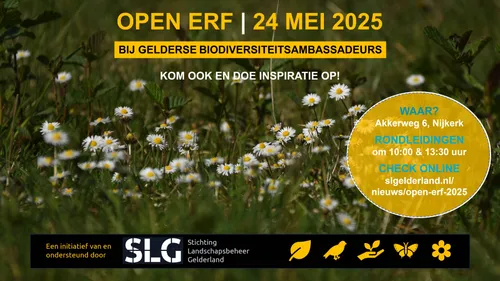 De Dag van het Open Erf vindt dit jaar voor de tweede keer plaats op zaterdag 24 mei, twee dagen na de Dag van de Biodiversiteit. In twintig Gelderse gemeenten stellen ambassadeurs dan hun fraaie erven open voor bezoekers. De ambassadeurs van het Praktijknetwerk Biodiversiteit bij Buitenlui zijn particulieren die de biodiversiteit een handje helpen in hun tuin of op hun land. Zij geven informatie over het verhogen van de biodiversiteit op het erf, ook tijdens deze Dag van het Open Erf. Er is dan van alles te zien en te doen. Neem bijvoorbeeld een kijkje bij bloemenweides, poelen, hoogstamboomgaarden, vlechtheggen, houtwallen, natuurlijke tuinen, insectenhotels, voedselbossen, moestuinen en takkenrillen. Of laat je rondleiden door de ambassadeur.