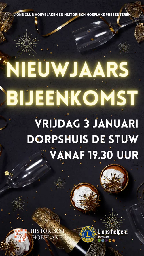Op vrijdag 3 januari 2025 organiseert Lions Club Hoevelaken - zoals elk jaar op de eerste vrijdag van een nieuw kalenderjaar - een nieuwjaarsbijeenkomst in Dorpshuis De Stuw. Inwoners en ook (oud-) Hoevelakers kunnen elkaar daar op een informele manier ontmoeten en goede wensen uitwisselen.