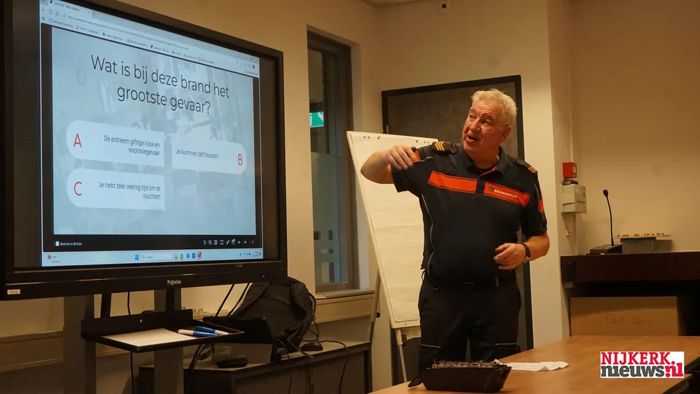 Daarna ging de helft van de leerlingen naar het instructielokaal. Daar werd ze onder andere voorgehouden, dat ze voorzichtig moeten zijn met accu's, bijvoorbeeld die van je mobiel. Je moet eigenmlijk goed nadenken over dat opladen en het liever niet met een alibaba-oplader doen. Alleen de originele opladers zijn behoorlijk brandveilig.
