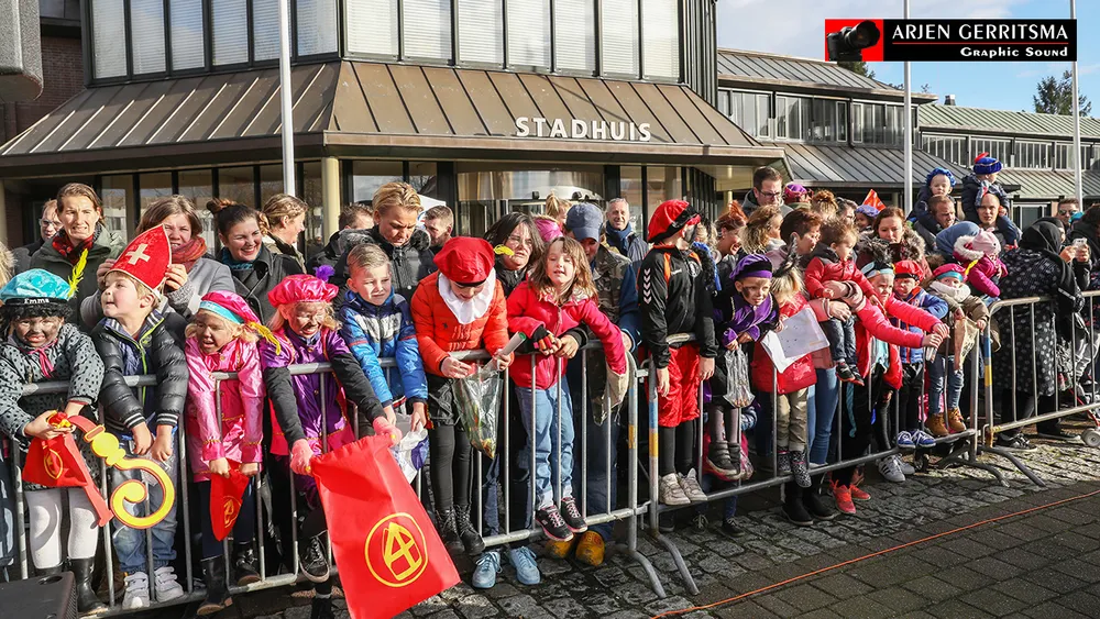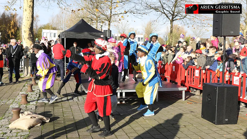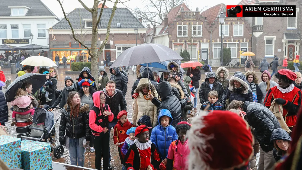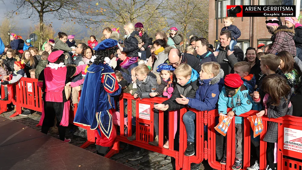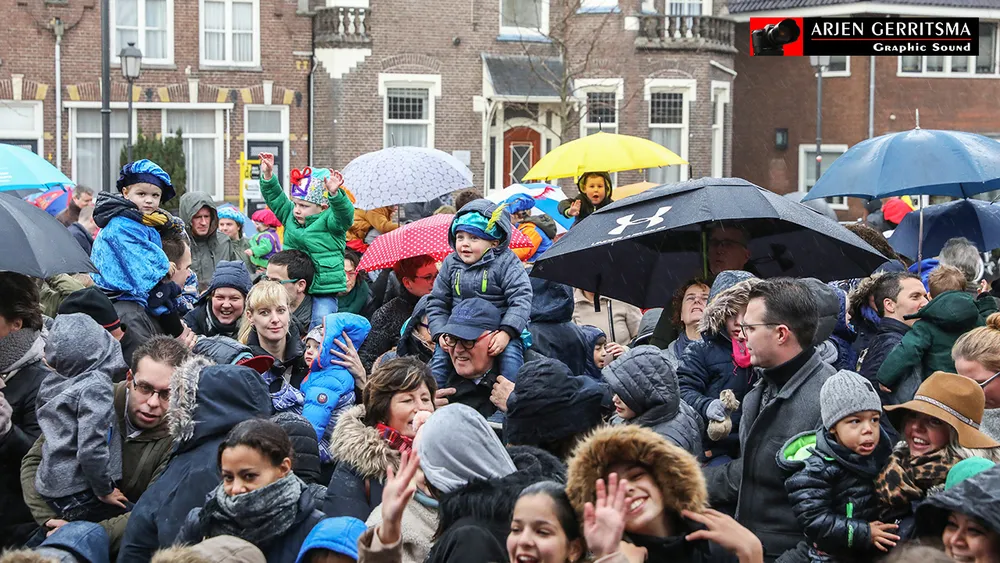 Rondom de haven was het afgeladen druk en werd Sint met veel gezang en dans onthaald. Daarna vertrok hij voor een tocht door de stad, die eindigde op het Molenplein. Daar eindigde het feestje met veel regen en een geluidsinstallatie, die het liet afweten. Niet dat dat veel uitmaakt, de ogen van de kinderen zijn vooral op de schoen gericht. Die wordt vanavond massaal gezet. Dat is zeker.