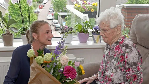 Zij werd van harte met deze grootse leeftijd gefeliciteerd, onderstreept door een mooie bos bloemen