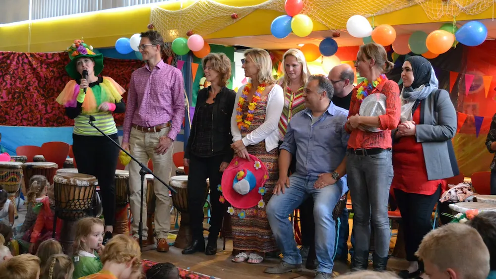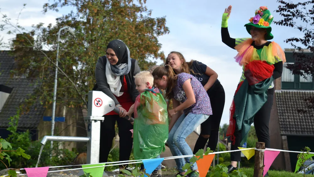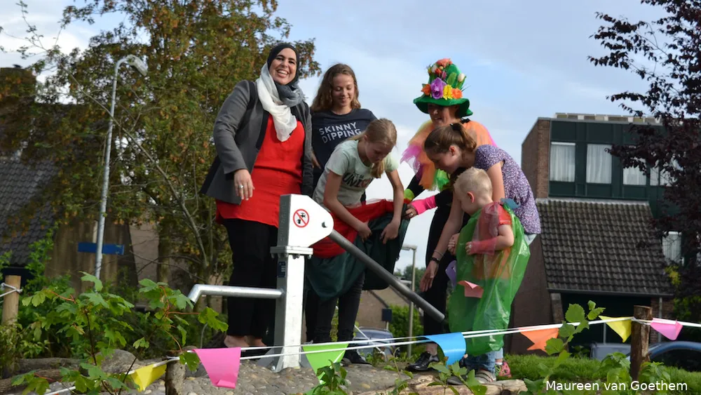 De officiële handeling, het onthullen van de waterpomp en het daarna in werking stellen, werd onder grote belangstelling van leerkrachten, (groot)ouders en kinderen bekeken. Toen dat eenmaal achter de rug was werd de Natuurlijke Beleeftuin bestormd door alle aanwezige kinderen.