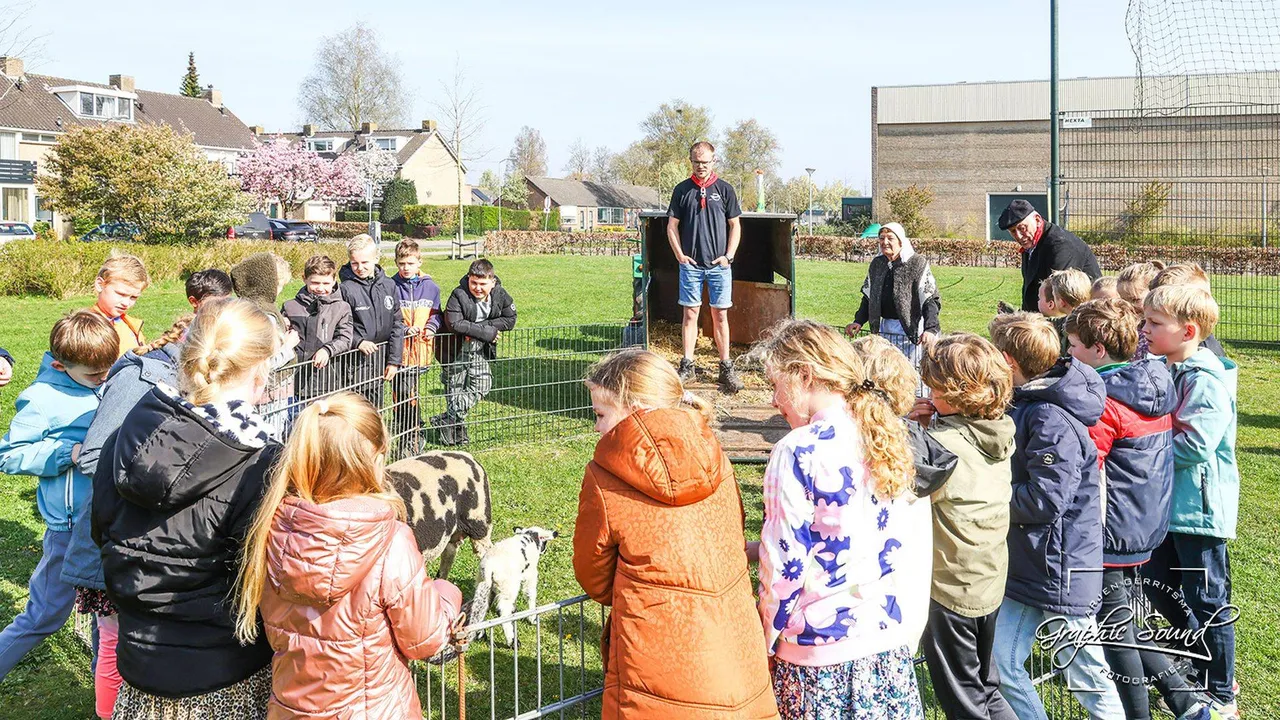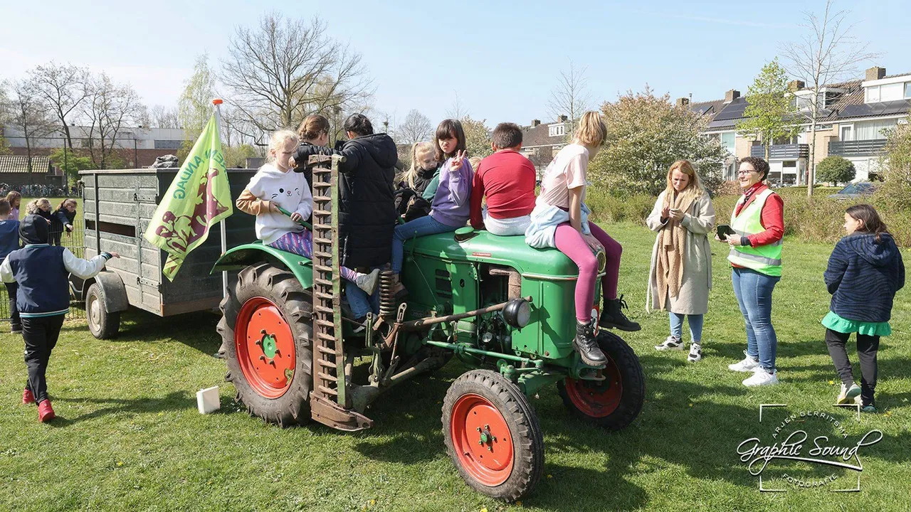 Van Velduizen was vergezeld van een par bestuursleden en van Gerrit en Hennie van Mispelaar. Zij waren in originele boerenkleding. Een uur lang kunnen de kinderen uit groep 4 en 5 klas voor klas op de tractor zitten, een lammetje aaien en al hun nieuwsgierige vragen stellen aan de boer en boerin. “Waarom hebben ze van die dingen in de oren?” vraagt een jongen terwijl hij naar het gele labeltje wijst. (met dank aan Nijkerker Lens).