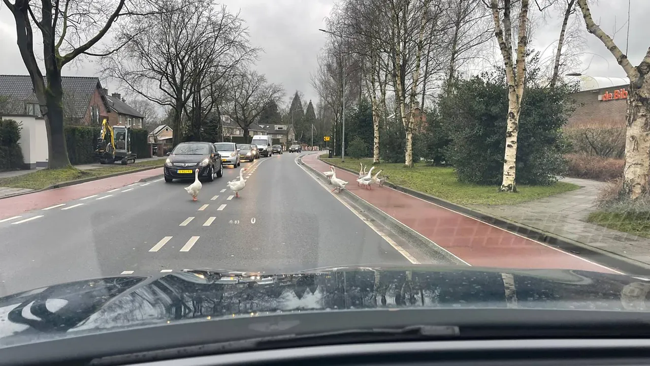 De ganzen staken al lummelend de weg gedeeltelijk over Na enige tijd hielp een bestuurder twee debatterende ganzen ook over het laatste stukje weg.