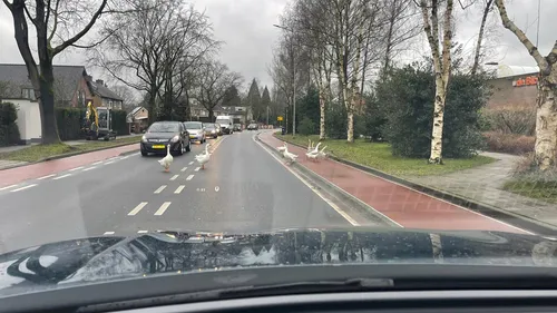 Onlangs werd het verkeer ter hoogte van de Bibliotheek Nijkerk ruime tijd opgehouden door wel 9 ganzen.