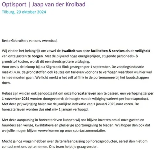 Optisport heeft aangekondigd dat als gevolg van stijgende kosten de prijzen in de horeca van hun locaties omhoog moeten.