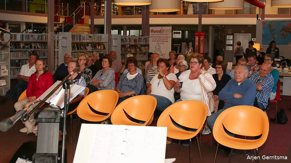 Dichter Jan van de Kuinder en de Nijkerkse band Kiezel verzorgden vrijdagavond een verrassend programma in de bibliotheek .