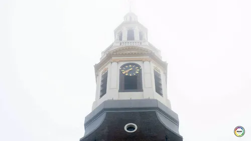 De Nijkerkse toren hulde zich op deze vroege ochtend van Koningsdag in de dichte mist.