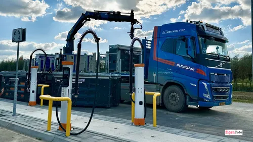 Achter de laadpunten staan grote omvormers waar gelijkspanning wordt geleverd. er kan tot 400kW worden snelgeladen bij elk van de laadpunten.