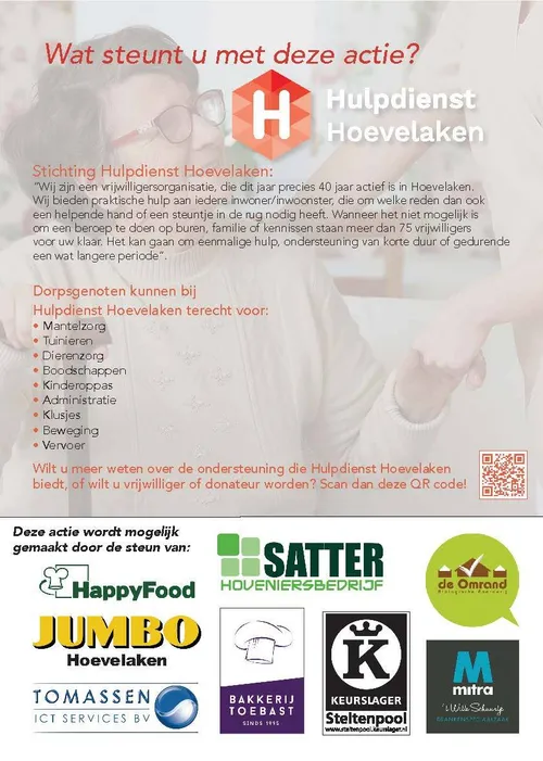 Stichting Hulpdienst Hoevelaken: “Wij zijn een vrijwilligersorganisatie, die dit jaar precies 40 jaar actief is in Hoevelaken. Wij bieden praktische hulp aan iedere inwoner/inwoonster, die om welke reden dan ook een helpende hand of een steuntje in de rug nodig heeft. Wanneer het niet mogelijk is om een beroep te doen op buren, familie of kennissen staan meer dan 75 vrijwilligers voor uw klaar. Het kan gaan om eenmalige hulp, ondersteuning van korte duur of gedurende een wat langere periode”.