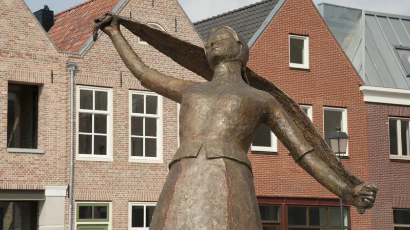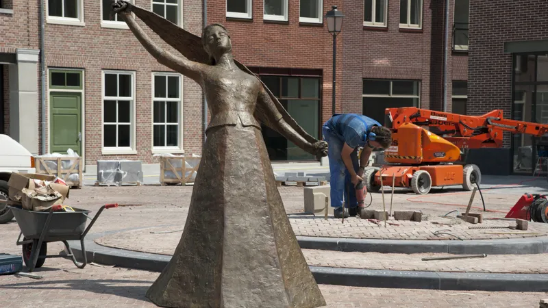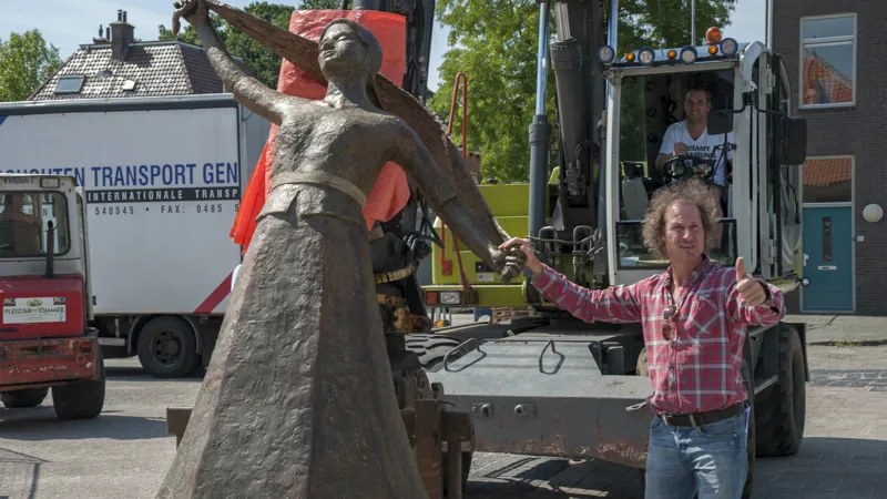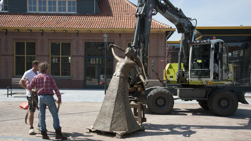 Donderdag is het bronzen beeld ' recht op de wind' op het Molenplein geplaatst.