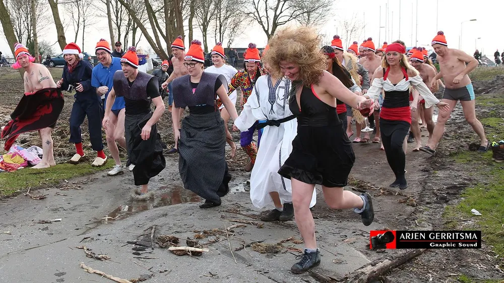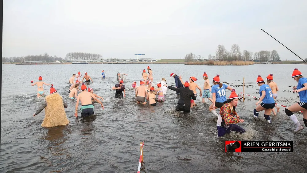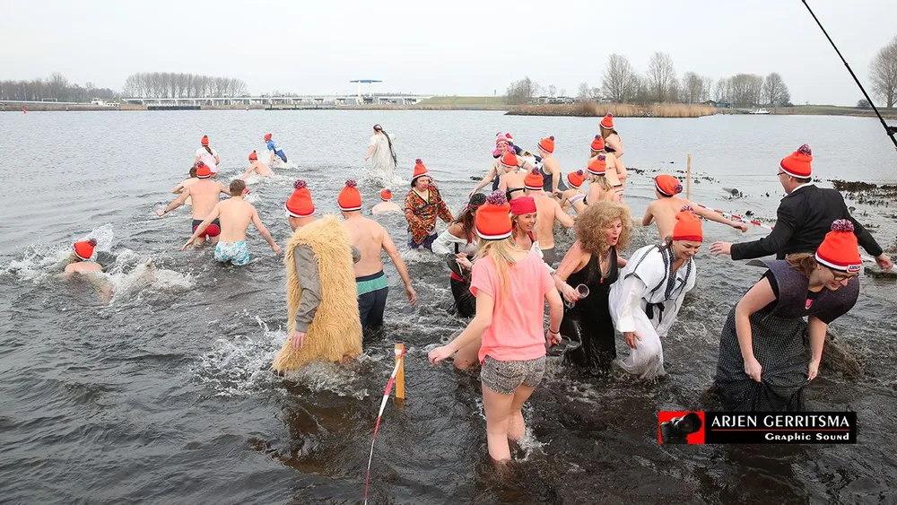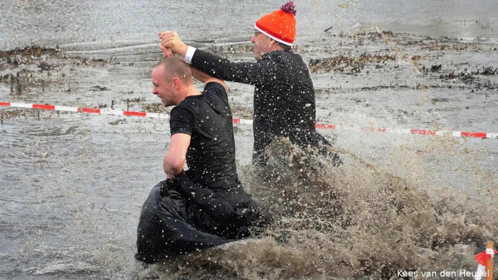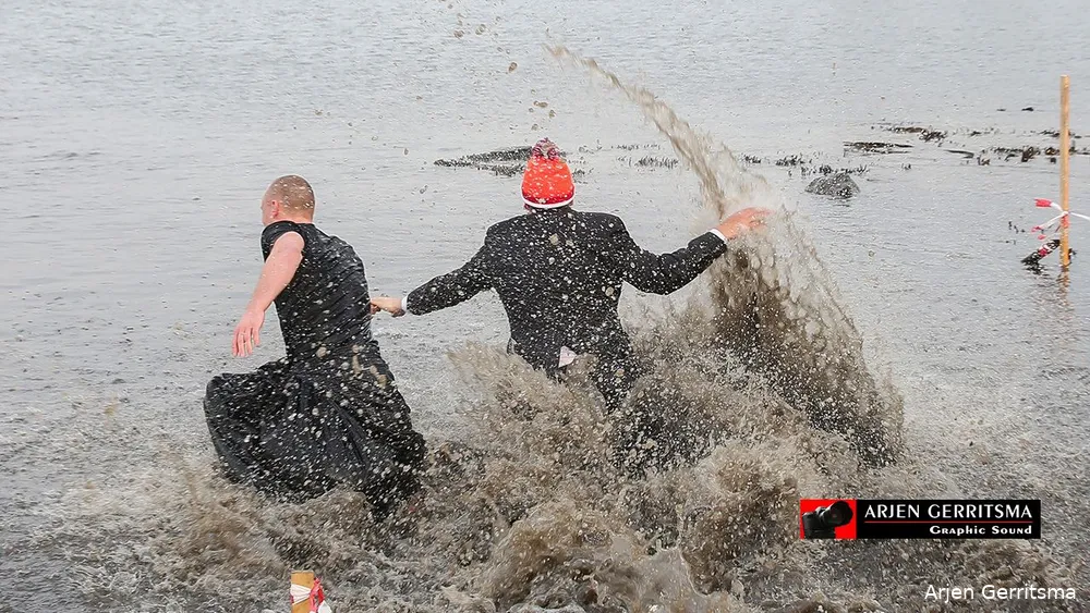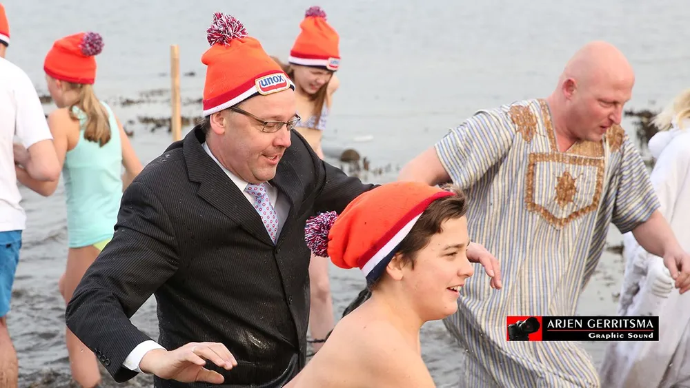 En dat viel niet mee, want de temperaturen logen er niet om. Met hier en daar wat gilletjes renden de durfallen het water in en een enkeling dompelde zich ook echt compleet onder, om vervolgens weer razendsnel naar de wateroever terug te rennen en zich te laven aan warme grog en een warme badjas.