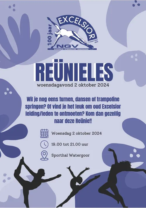 Op woensdagavond 2 oktober zal er een reünie plaatsvinden in sporthal Watergoor. Iedereen is welkom die betrokken is (geweest) bij de vereniging. Er zullen verschillende lessen gegeven worden op deze avond. Dus haal het sporttenue uit de kast en kom weer ouderwets jazzdansen, zwaai nog eens in de ringen, wandel over de balk of spring op de trampoline. De lessen zullen verzorgd worden door recente en oude leiding. Liever niet actief deelnemen? Kom dan gezellig een kopje koffie of thee d