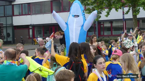 en een dansende haai op een trailer werden de wandelaars in één lang lint feestelijk over de Wiekslag en de Brink geleid met vele honderden toeschouwers langs de lijn die de wandelaars enthousiast onthaalden met applaus, bloemen, snoep en cadeaus.