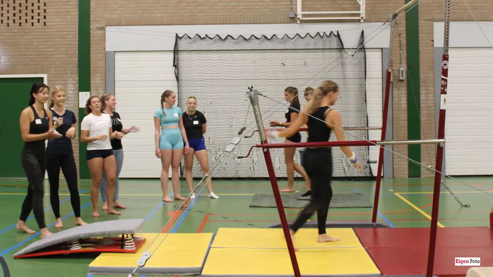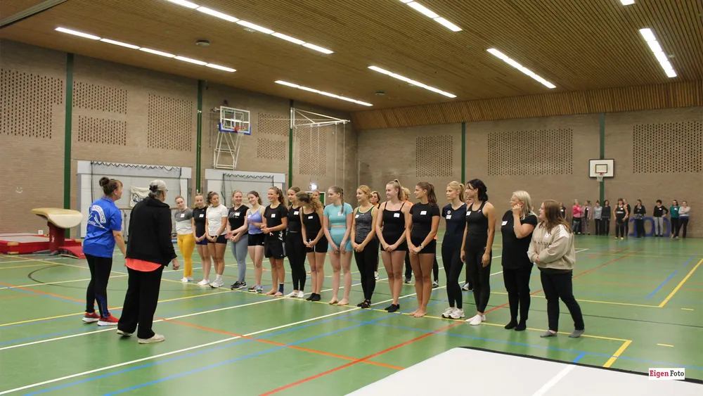 Selectietrainster turnen Marieke Duits en oud leidster Will Roest verzorgen een warming-up waarna op de toestellen nog oude onderdelen geoefend konden worden.