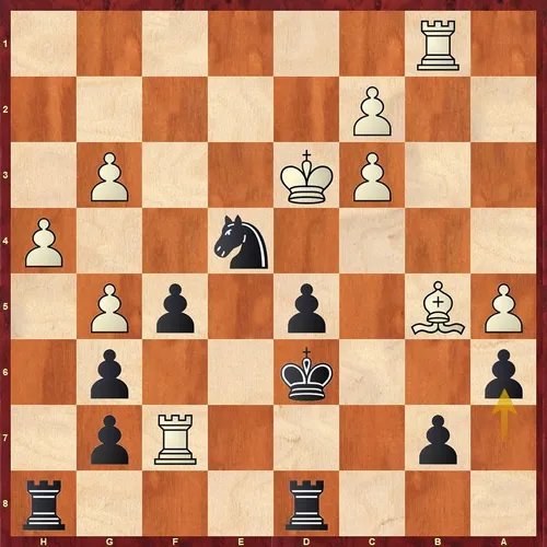 1.d4 d5 2.Pf3 c6 3.Pc3 Lf5 4.Lf4 Pf6 5.e3 e6 6.Ld3 Lg6 7.Pe5 Pbd7 8.Pxg6 hxg6 9.Df3 Ph5 10.g4 Pxf4 11.exf4 Lb4 12.f5 Df6 13.De3 0-0-0 14.a3 Lxc3+ 15.bxc3 exf5 16.g5 Dd6 17.Dg3 Tde8+ 18.Kd2 Dxg3 19.fxg3 Pf8 20.Tab1 Pe6 21.h4 Kc7 22.a4 Td8 23.a5 c5 24.The1 The8 25.Lb5 Th8 26.dxc5 Pxc5 27.Te7+ Kd6 28.Txf7 Pe4+ 29.Kd3 a6 Deze pionzet lijkt winnend. De witte loper heeft geen goed veld op het eerste gezicht maar schijn bedriegt. De loper kan de pion op a6 eenvoudig slaan en als zwart met de b7-pion op a6 de loper neemt is het mat in twee. Ikzelf heb dat uiteraard die avond niet voorzien. Wit speelt echter Le8 om de witte torens meer te kunnen activeren. Op zich een verrassende en creatieve zet.
