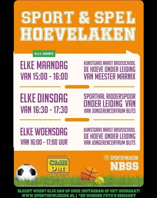 Maandag – 15.15 – 16.15 uur Sport en Spel door Nijkerk Sportief & Gezond, locatie: Kunstgras naast basisschool de Hoeve