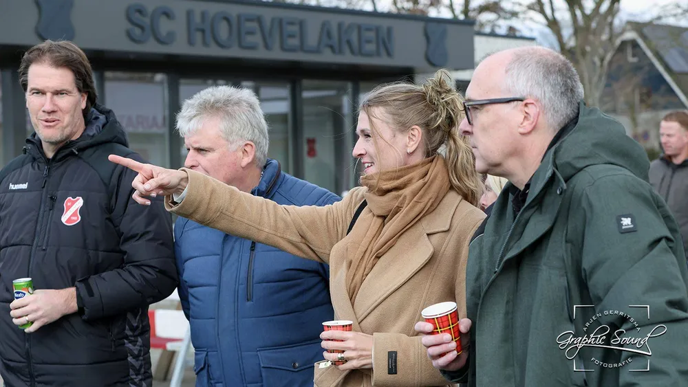 Langs de lijn stond burgemeester Trinet de Jonge, die eerste met het bestuur van de voetbalvereniging kennis had gemaakt.