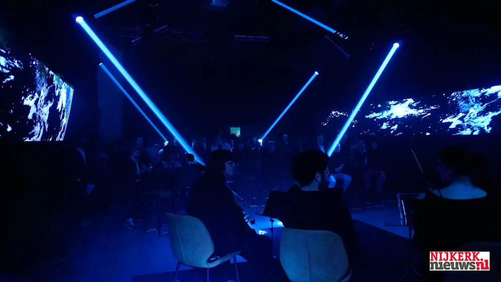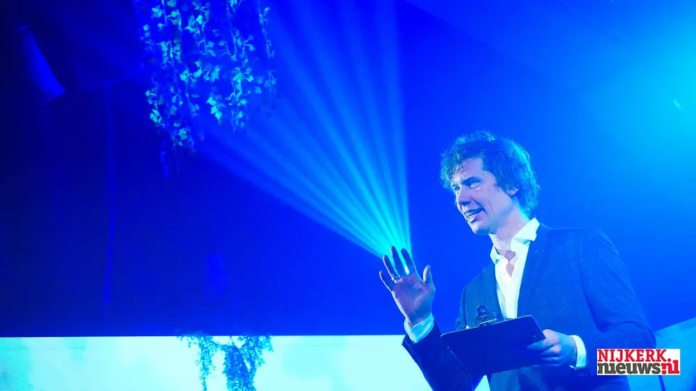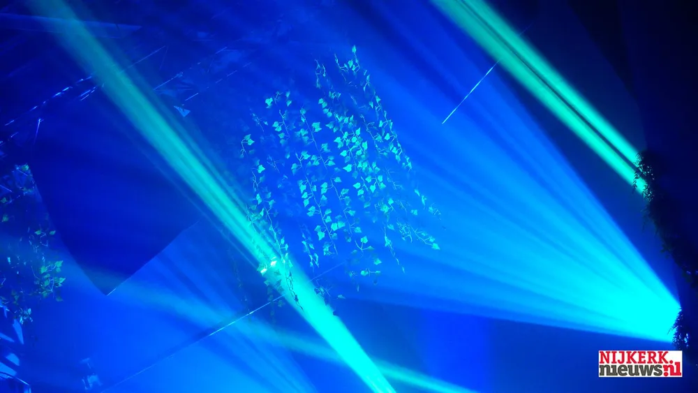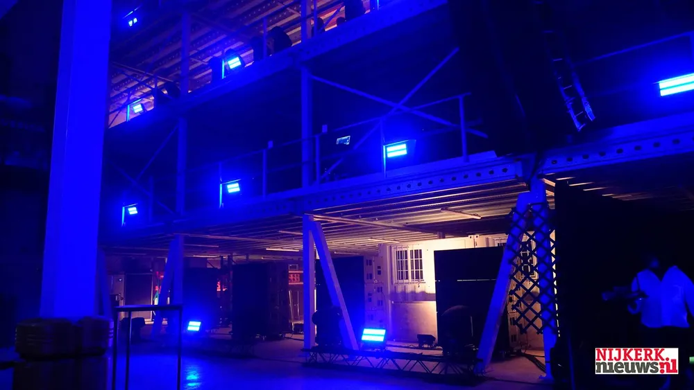 Eigenaar Sijmen Hoekstra in het licht van zijn eigen lichtshow, een onderdeel van het openingsfeest van het nieuwe pand aan de Sindelererf 6.